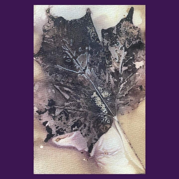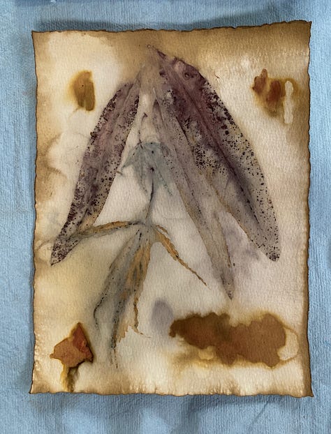 I’ve been discovering the winter Fae of Decay in these last few eco printing sessions of the season. Playing around with fall leaves, iron mordant, and onion-skin dye-baths has produced some beautiful, dark, and mysterious prints full of the Fae of Decay.